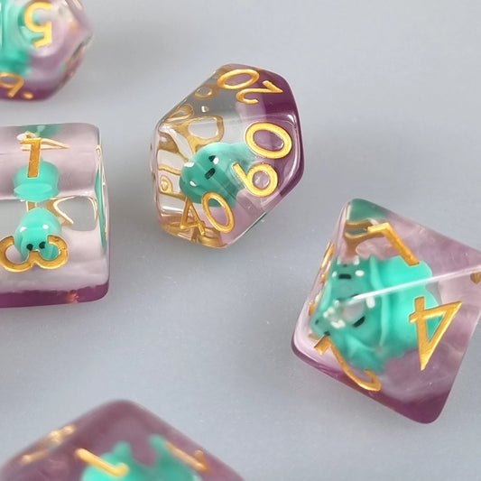 Each die has a tiny, cute unicorn inside, so you'll always have a magical friend by your side. Plus, the set comes with 7 dice in total, so you'll always have one ready to roll whatever you need in your game. Whether you're just starting out or are a seasoned tabletop gamer, this set is sure to bring a smile to your face. So don't wait any longer, add the Unicorn Polyhedral Dice Set to your basket today!